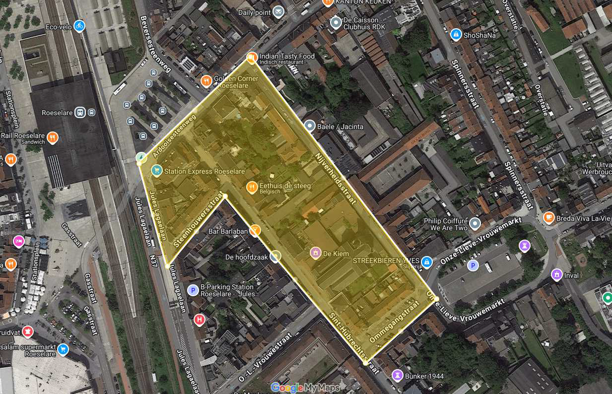 Het samenscholingsverbod geldt in de zone afgebakend door volgende straten: Nijverheidsstraat - Ardooisesteenweg (exclusief bushavens) - Jules Lagaelaan -Steenhouwersstraat - Sint-Hubrechtsstraat - Ommegangstraat. Het verbod geldt steeds van gevel tot gevel over de volledige breedte van de openbare weg (beide kanten van de weg) met uitzondering van de Ardooisesteenweg ter hoogte van de bushavens die niet omvat zitten in dit verbod.